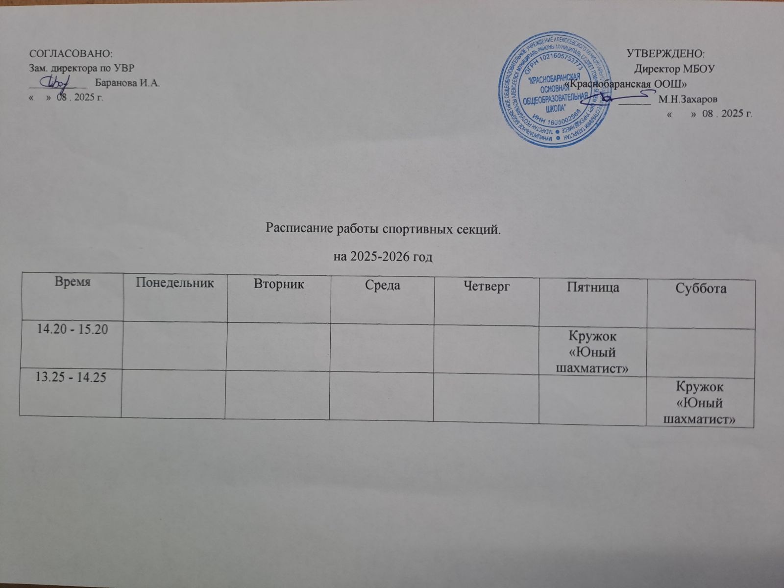 Расписание работы ШСК на 2025 - 2026 уч.год