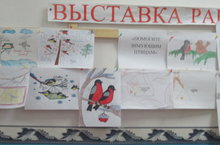 Ребята начальных классов организовали выставку рисунков "Помоги зимующим птицам"