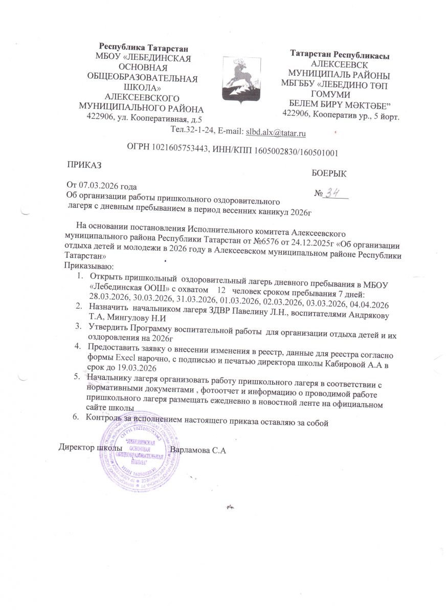 Муниципальное бюджетное общеобразовательное учреждение "Лебединская основная общеобразовательная школа" Алексеевского муниципального района Республики Татарстан / Татарстан Республикасы Алексеевск муниципаль районы "Лебедино гомуми төп белем бирү мәктәбе" муниципаль бюджет гомуми белем бирү учреждениесе
