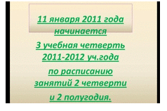 Согласно годовому календарному учебному графику для МБОУ Левашовской СОШ на 2011/2012 учебный год, 11 января 2012 года начинается третья четверть учебного года по расписанию занятий 2 четверти и второго полугодия. . Для первоклашек традиционно будут устроены дополнительные каникулы в середине третьей четверти.