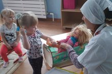 В группе первого младшего возраста "Затейники проводилась сюжетно-ролевая игра "В гостях у Айболита". Цель игры: уточнить и упорядочить знания детей о труде врача, о предметах - помощниках доктора. Обогащать словарь детей. Воспитывать дружеские взаимоотношения, желание прийти на помощь другу.