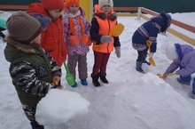 Дети подготовительной к школе группы «Непоседы» решили на прогулочном участке изготовить горку. Все ребята работали дружно: одни подвозили снег на ледянках, другие подносили на лопатах рыхлый снег. ....