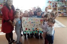 К трехлетию нашего детского сада в средней группе «Капитошки» в ходе НОД по художественно-эстетическому развитию с детьми была сделана коллективная работа «Поздравительная открытка детскому саду».
