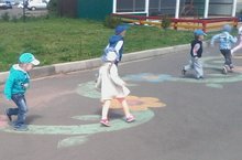Во время прогулки дети группы «Звездочки» с удовольствием играют в различные игры, нарисованные на асфальте на территории детского сада.