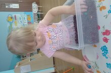 В ходе занятия ребята второй группы раннего возраста «Звездочки» играли в дидактическую игру с сыпучим материалом «Найди клад». Ребята очень старались найти предметы, спрятанные в сухом бассейне, а так же называли их цвет.