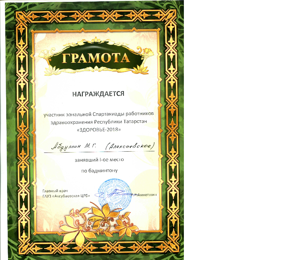 Абдуллин 1 место в занальной Спартакиаде по бадминтону.png