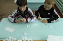 Полным ходом идет подготовка к Новому году! Дети учат стихи для Деда Мороза, репетируют песни, танцы. Начальные классы для украшения зала вырезают снежинки.