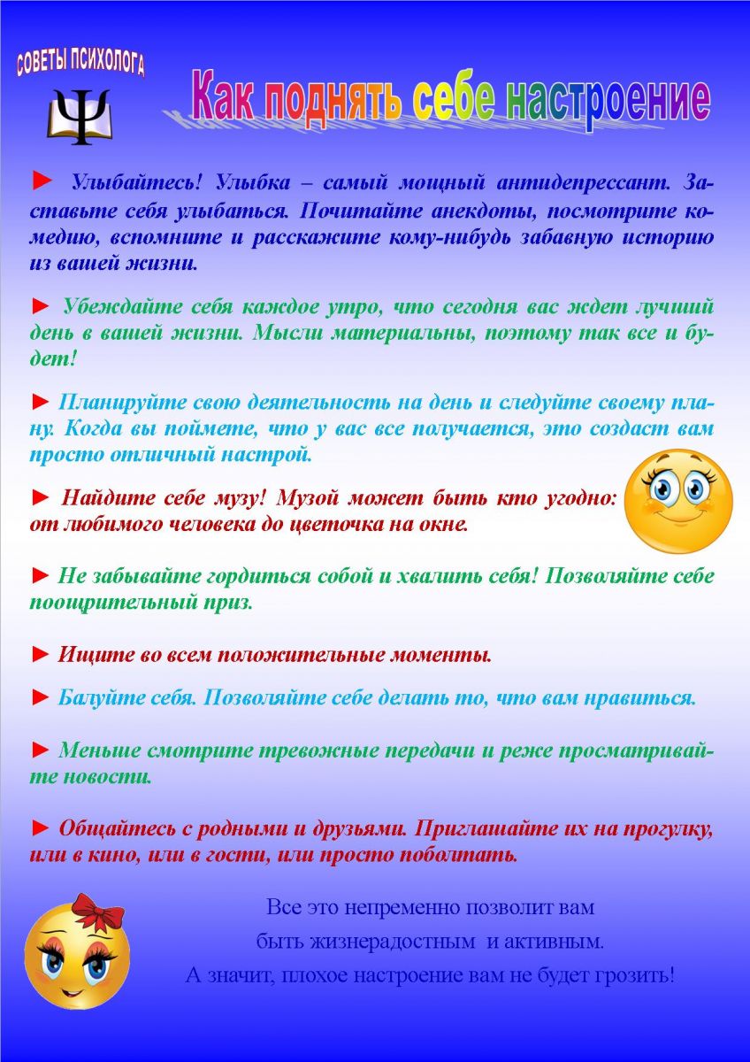 В рамках недели "Шаги к психологическому благополучию" в школе была проведена Акция "Мое настроение", которая началась с встречи обучающихся и учителей хорошим настроением, пожеланиями добра, света и радости. Учащиеся выразили свое настроение в виде смайликов, которые разместили на дверях класса. Проанализировав настоение , актив школы раздали учащимся информационные листовки с рекомендациями «Как улучшить настроение?»