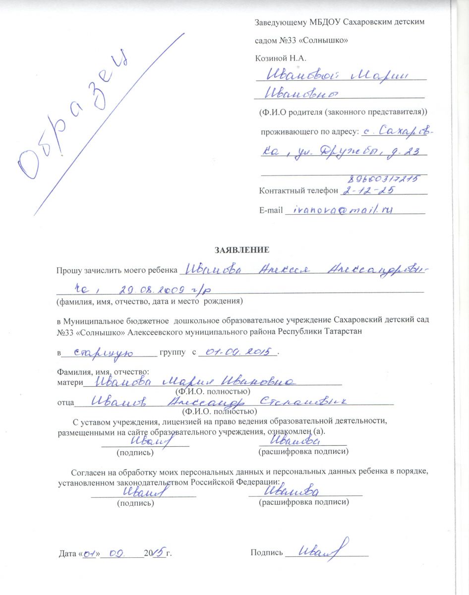 Образец заполнения заявления о зачислении ребенка в детский сад