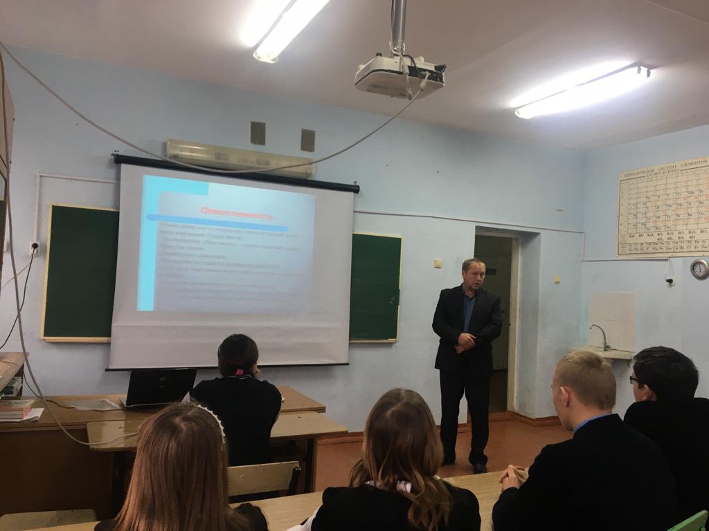 В понедельник 24 октября в Сахаровской школе депутат сельского поселения Мигушин Вячеслав Алексеевич провел для учеников 8-9 классов урок по правовому просвещению школьников «Мы в ответе за свои поступки». В рамках урока депутат обсудил какие принципы должны быть у человека, поднял на обсуждение вопрос правды и лжи и рассказал про свои любимые книги, про свою гражданскую позицию . «Я хочу сказать, что такие уроки обязательно нужны. Вообще с молодежью нужно разговаривать чаще и больше, доносить свою позицию. Раскрывать общечеловеческие ценности, объяснять, что такое добро, что такое зло, делиться жизненным опытом".