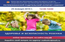 Во исполнение плана работы Министерства образования и науки Республики Татарстан 25.01.2019 с 12.3 до 14 состоится Республиканский родительский интернет-семинар «Здоровье и безопасность ребенка».Он-лайн трансляция собрания будет вестись на сайте Казанского инновационного университета имени В.Г.Тимирясова по адресу: https://ieml.ru/ .