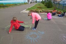 На территории школы учащиеся начальных классов участвовали в конкурсе рисунков на асфальте «Любимый Татарстан»