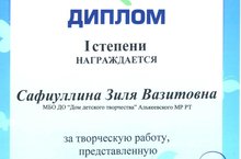 VIII Открытый республиканский фестиваль искусств, ремесла и декоративно-прикладного творчества "Алтын куллар" состоялся 16 марта 2016 года в городе Набережные Челны. Учитель технологии Сафиуллина З.В. показала мастер-класс по номинации "Декупаж" и стала победителем в этой номинации. Ее ученица Зарипова А. заняла 1-место в двух номинациях: в номинациях "Декупаж" и "Картмейкинг". Молодцы!
