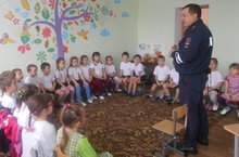 Инспектор ГИБДД провел с воспитанниками детского сада беседу о правилах безопасного поведения на дороге. Проверил знания детей по правилам дорожного двидения.