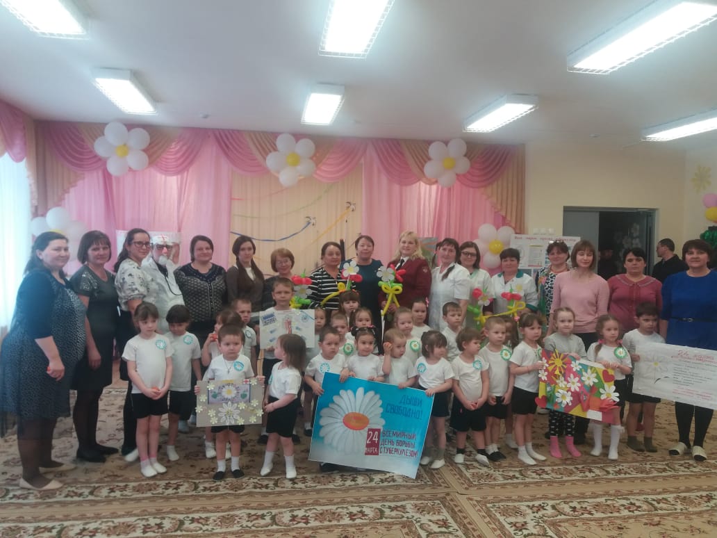 Зал был оформлен ромашками из шаров, различными плакатами и рисунками на тему туберкулеза и здорового образа жизни. Оформили информационные материалы, буклеты для родителей по вопросам профилактики и распространения туберкулеза: «Туберкулез — это серьезно!», «Туберкулез излечим!», «Как спасти ребенка от туберкулеза», «Не допусти туберкулез». Организовали конкурс детских рисунков «Я здоровье берегу, сам себе я помогу».