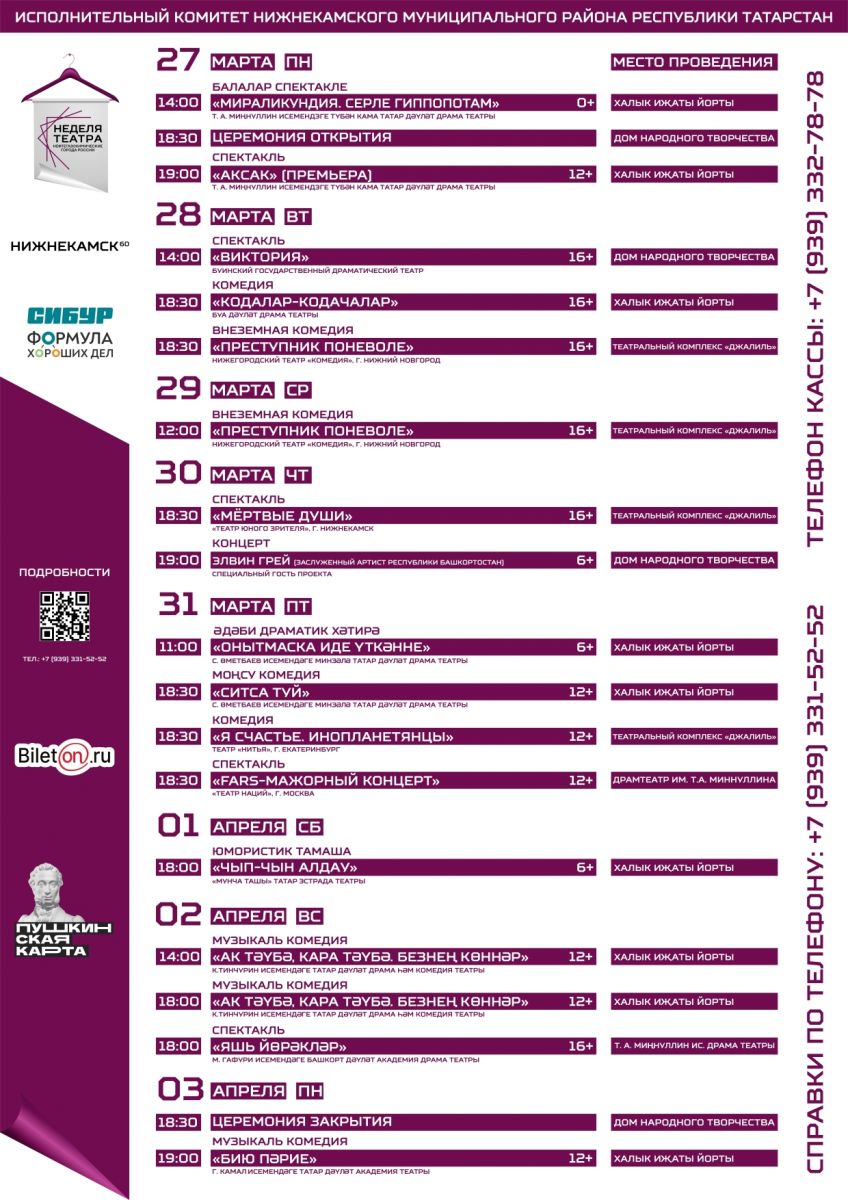 С целью популяризации театрального искусства, приобщения населения к лучшим традициям различных театральных направлений, с 27 марта по 3 апреля 2023 года на трёх площадках г. Нижнекамск: