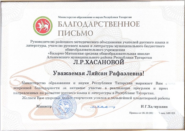 За активное участие в реализации программ и проектов, направленных на развитие русского языка и литературы в Алькеевском муниципальном районе, руководитель районного методического объединения учителей русского языка и литературы Хасанова Ляйсан Рафаэлевна награждена Благодарственным письмом Министерства образования и науки Республики Татарстан.