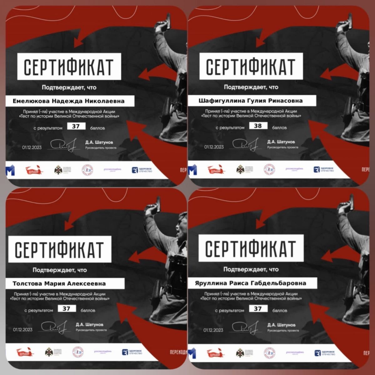 Опубликовано: 02.12.20231 декабря учащиеся школ района вместе со своими учителями истории, наставниками приняли участие в Международной акции "Тест по истории Великой Отечественной войны".Вопросы были разные, сложные, интересные. Всё это позволило вспомнить об известных и неизвестных героях Великой войны.