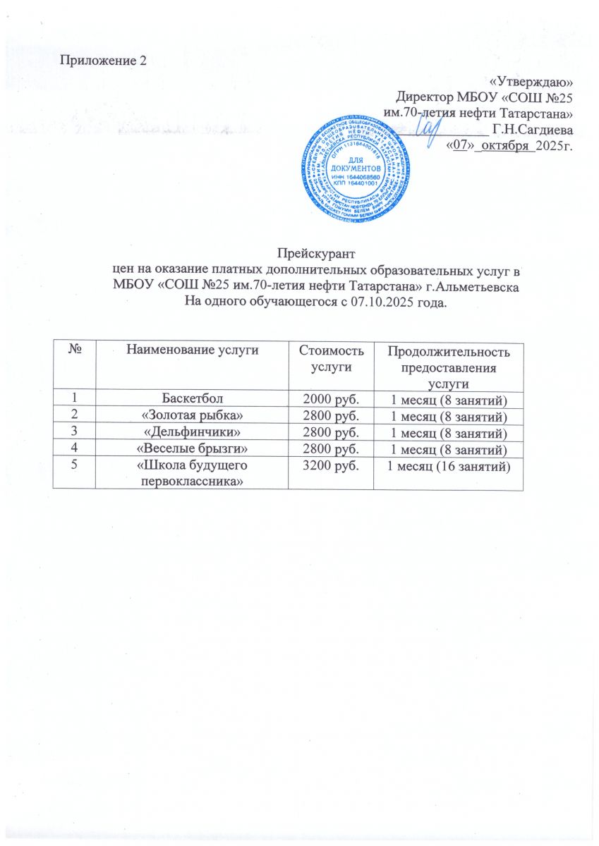 Прейскурант цен на оказание платных дополнительых образовательных услуг 2025 - 2026 уч.год.