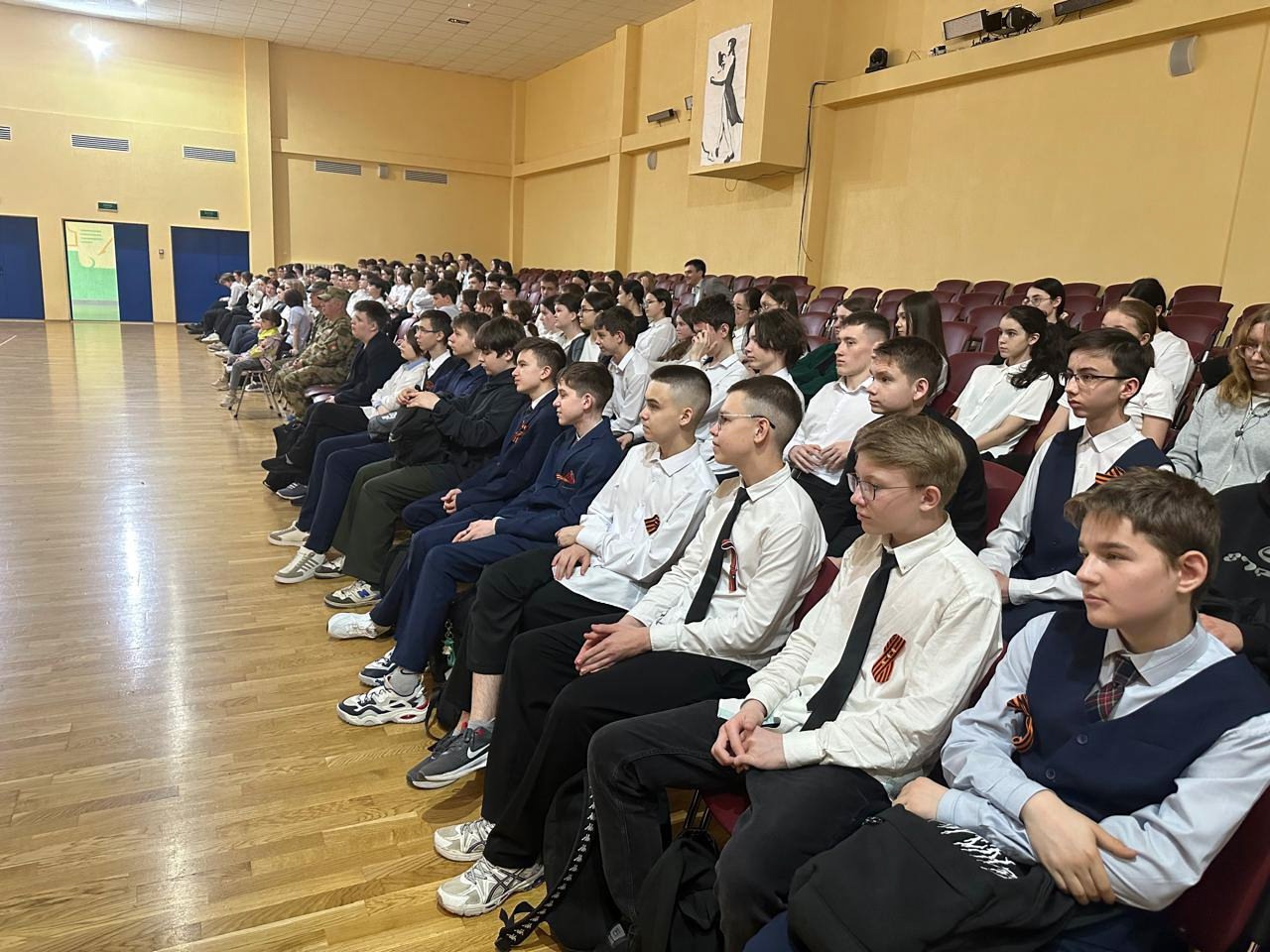 Сегодня в нашей школе прошел урок мужества, организованный и проведенный ответственным Карнауховым А.В. Мероприятие, собрало учеников 8 классов в актовом зале.