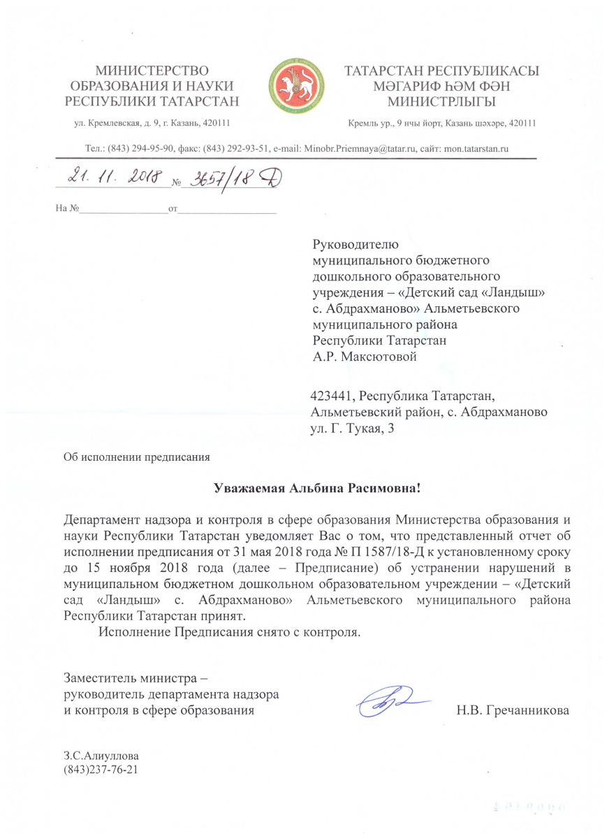 Письмо обрнадзора об исполнении предписания.