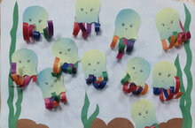 Расширяем знания о морских обитателях. Формируем понятие один и много. Развиваем мелкую моторику. Воспитанники изготовили аппликацию "Осьминожки".