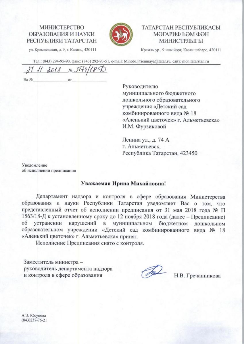 Уведомление об исполнении предписания от 27.11.2018 № 3774/18Д