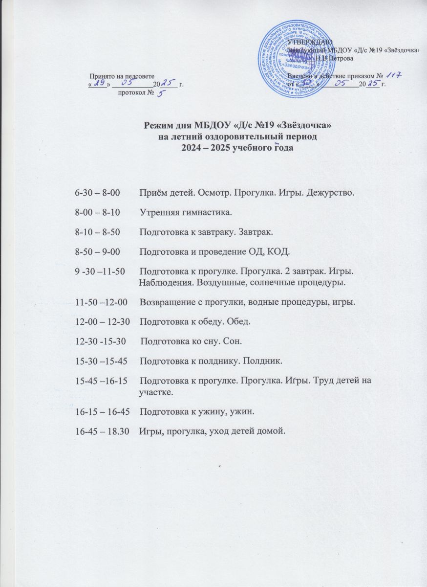 Режим дня на летний оздоровительный период 2024-2025 учебный год