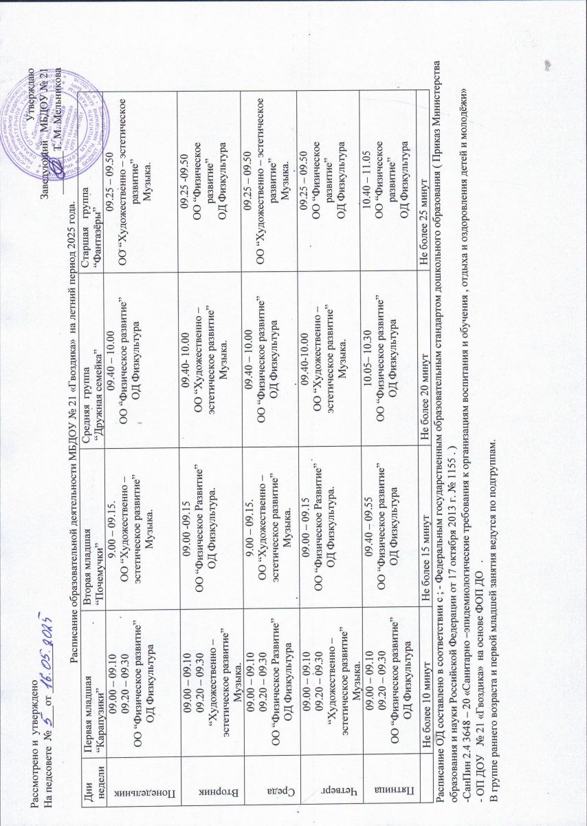 Расписание ОД на летний период 2025 г.