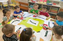 Задачи: закреплять знание о зеленом и желтом цвете; развивать умение располагать рисунок по всему листу; активизация словаря по теме; воспитывать доброжелательное отношение к насекомым и игровым персонажам; воспитывать аккуратность при рисовании красками: намазывать один край пробки краской, снимать лишнюю о край баночки и ставить на бумаге отпечаток.