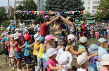 Гигантский живой паровозик пострили сегодня воспитанники во время летнего развлечения, направленного на закрепление знаний правил дорожного движения.