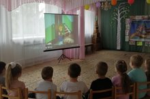 Просмотр мультфильма "Правила безопасности детей на природе, при пожаре" с детьми подготовительной группы "Дружба".