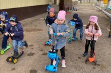 В старшей группе "Ладушки" повторили правила дорожного движения и научились правильно кататься на самокате.