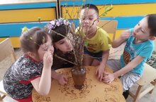 Дети наблюдают за распусканием почек на срезанных ветках, рассматривают и сравнивают растения.