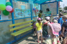 В рамках месячника "Внимание, дети!" в детском саду была организована акция "Весёлая остановка". Дети развесили на остановке шары и плакаты, призывающие соблюдать правила безопасного поведения на дорогах.