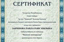 Балалар бакчабызның татар теле тәрбиячесе Зарипова Р.Р. "Сабыем" -балалар, ата-аналар, тәрбиячеләр өчен сайтында эш тәҗрибәсе белән уртаклашты. "Минзифа Әхмәтшина белән очрашу кичәсе" темасына сценарий урнаштырып,кызыклы шигырьләр бастырганы өчен, "Куңелле шигырьләр" исемле сертификат белән бүләкләнде.