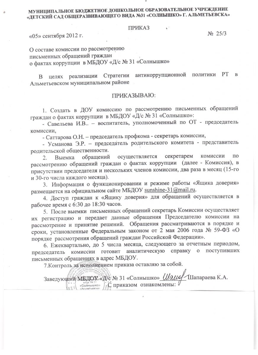 План работы по антикоррупционной деятельности МБДОУ "Д/с № 31 "Солнышко" на 2012-2013 уч.г.