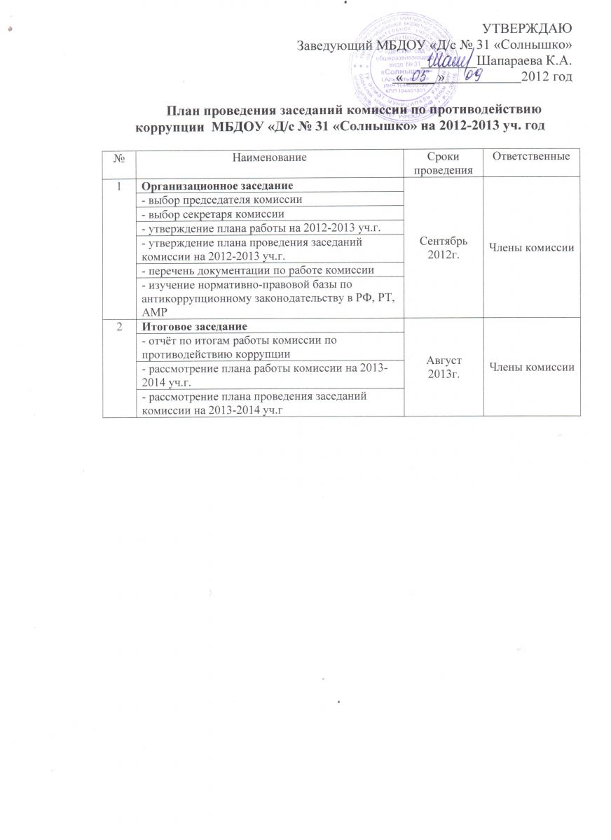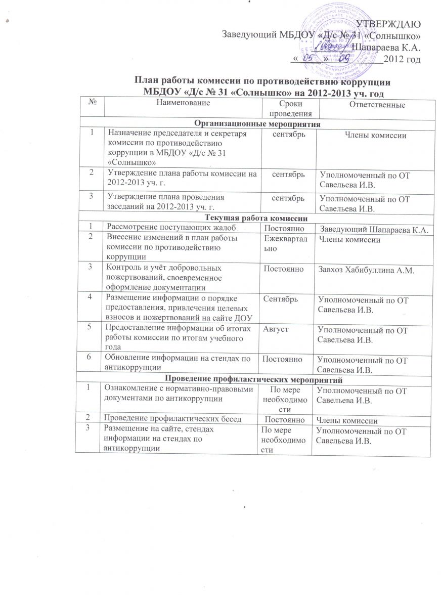 План работы комиссии по противодействию коррупции МБДОУ "Д/с № 31 "Солнышко" на 2012-2013 уч.г.