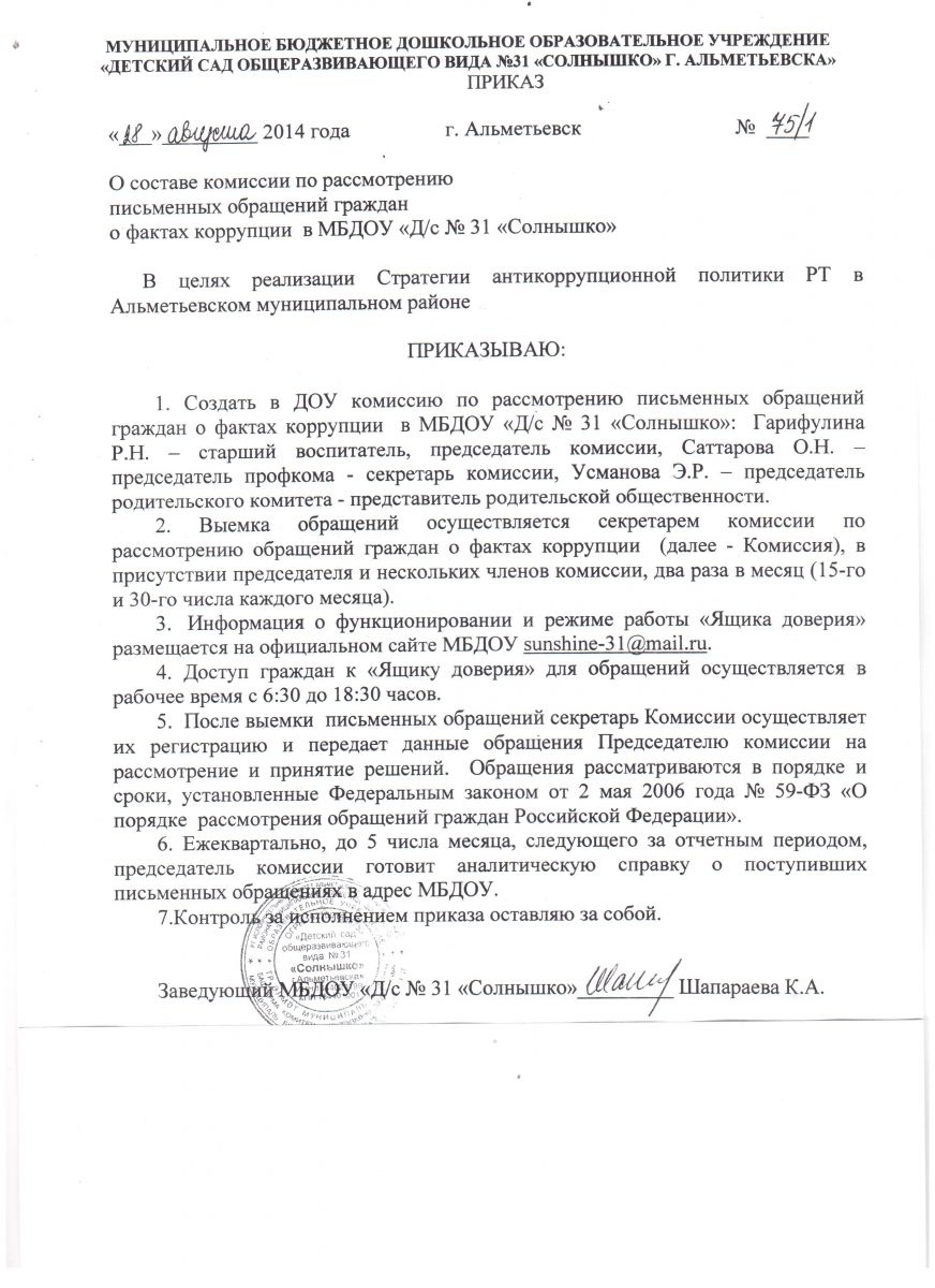 План работы комиссии по противодействию коррупции МБДОУ "Д/с № 31 "Солнышко" на 2015-2016 уч.г.