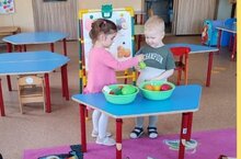 В первой младшей группе "Зайчики", продолжаем формировать у детей представления об овощах и фруктах, как витамины полезны для здоровья, в процессе игры закрепляем знания детей о характерных признаках овощей и фруктов: цвет, форма, вкус; формируем представление о бережном отношении к своему здоровью.