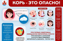 Корь – вирусная инфекция, для которой характерна очень высокая восприимчивость. Если человек не был привит от этой инфекции, то после контакта с больным заражение происходит практически в 100% случаев. Вирус кори отличается очень высокой летучестью. Вирус может распространяться по вентиляционным трубам и шахтам лифтов – одновременно заболевают дети, проживающие на разных этажах дома. Единственной надежной защитой от этого заболевания является вакцинация против кори, которая включена в Национальный календарь прививок. По показаниям вакцинация необходима всем контактировавшим с больным корью, у которых нет достоверных сведений о сделанной коревой прививке или перенесенной в прошлом кори. Вакцины против кори создают надежный иммунитет, сохраняющийся более 20 лет. Но если Ваш ребенок все же заболел, необходимо: срочно обратиться за медицинской помощью (вызвать врача из поликлиники или в случае тяжелого состояния вызвать скорую медицинскую помощь); не посещать поликлинику самостоятельно, а дождаться врача; до прихода врача свести контакты с родственниками до минимума; при кашле и чихании прикрывать рот и нос, используя носовой платок или салфетку; чаще мыть руки водой с мылом или использовать спиртосодержащие средства для очистки рук; использовать средства защиты органов дыхания (например, маску или марлевую повязку). Необходимо помнить, что корь является острым инфекционным заболеванием с высоким уровнем восприимчивости. Проблема распространения заболевания состоит в том, что корь довольно трудно диагностировать на ранних этапах. Первыми проявлениями болезни являются высокая температура и покраснение горла. Понятно, что такие же симптомы характерны также гриппу и ОРВИ. Отличительные признаки кори – светобоязнь и сыпь. Но они появляются через 3-4 дня после заражения. Не последнюю роль играет и ошибочное представление о кори, как о легком заболевании. Вместе с тем установлено, что осложнения (пневмония, отит, энцефалит, эпилептические припадки) наступают у каждого 15 заболевшего корью ребенка. В ряде случаев после перенесенного заболевания наступает потеря слуха. Наиболее эффективной мерой профилактики и борьбы с корью является иммунизация населения. В настоящее время Национальным календарем профилактических прививок РФ предусмотрена 2-кратная иммунизация против кори детей в возрасте 12 месяцев и 6 лет, а также иммунизация взрослых до 35 лет, не болевших корью, ранее не привитых или привитых однократно против этой инфекции. При этом уделяется особое внимание иммунизации населения из групп риска: медицинских работников, педагогов, студентов, работников торговли, транспорта, коммунальных служб и других, а также мигрантов и кочующего населения. В очагах инфекции прививкам принадлежат все лица, имевшие контакт с заболевшим, без ограничения по возрасту, не болевших ранее. Не привитых или привитых однократно. Не рискуйте своим здоровьем и здоровьем своих детей – своевременно проведите вакцинацию против кори!