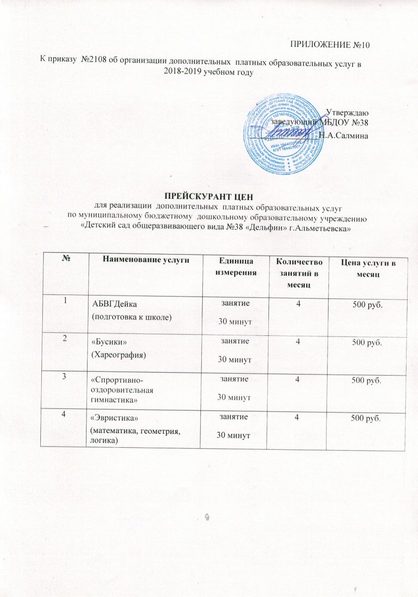 Прейскурант цен дополнительные платные образовательные услуги на 2018-2019 учебный год