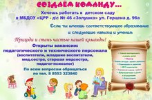 В МБДОУ "ЦРР - д/с № 46 "Золушка" имеются вакансии. Хотите стать частью нашей команды, тогда мы ждём Вас по адресу: ул.Герцена, д.96а. По возникшим вопросам можно позвонить по тел: 8(8553)32-38-40. Мы ждём Вас!!!