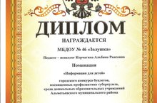 Победителем в номинации "Информация для детей" стала педагог-психолог МБДОУ №46 "Золушка" Корчагина Альбина Раисовна, за что награждена ценным подарком для оснащения кабинета. -