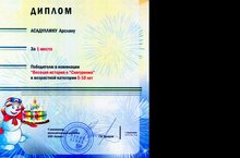Победителем муниципального конкурса детского творчества "Снегурёнок - 2012" стал воспитанник старшей группы МБДОУ "Центр развития ребёнка - детский сад № 50 "Лэйсэн" города Альметьевска" Асадуллин Арслан.