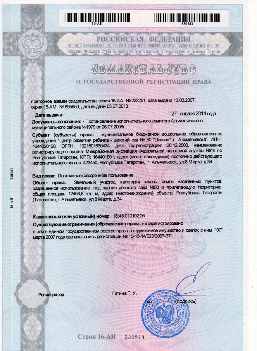 Свидетельсто о государственной регистрации права на недвижимое имущество: здание детского сада