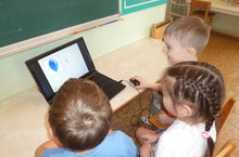 Воспитатели группы № 14 учат детей играть в компьютерные игры.