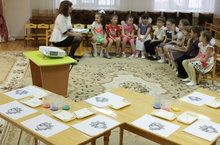 На занятии по звукопроизношению дети знакомились со звуком и буквой А. Учились различать этот звук на слух в ряду других гласных звуком, определяли место звука в слове. Перед зеркалом уточняли артикуляцию звука. Печатали букву в тетради, выкладывали из счётных палочек.