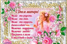 ДЕНЬ МАТЕРИ 22.11.2019Поздравляем с днем Матери женщин!День осенний не грустен совсем.В мире есть непреложные вещи.Семьи нас сберегут от проблем.Мы хотим пожелать больше счастья,Пусть рассвет озаряет всегдаТой мечтой, что должна исполнятьсяИ не будут напрасны года!