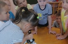 В старшем дошкольном возрасте продолжается опытно – экспериментальная деятельность. Особый интерес был проявлен у детей подготовительной группы при знакомстве с приборами для наблюдения микромира – лупой и микроскопом. Лупу дети могут встретить и в повседневной жизни, так как во многих семьях они имеются. А вот настоящий микроскоп дети видели впервые, что вызвало активный познавательный интерес.